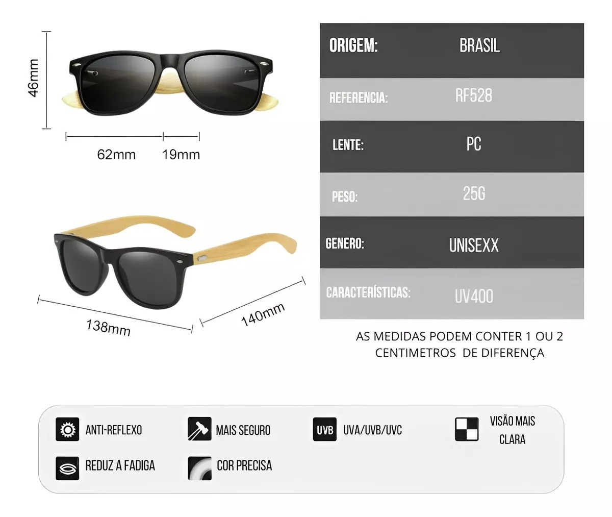 Além de versátil, é ideal para te acompanhar no dia a dia. As lentes possuem proteção UV400, te protegendo dos raios nocivos do sol.